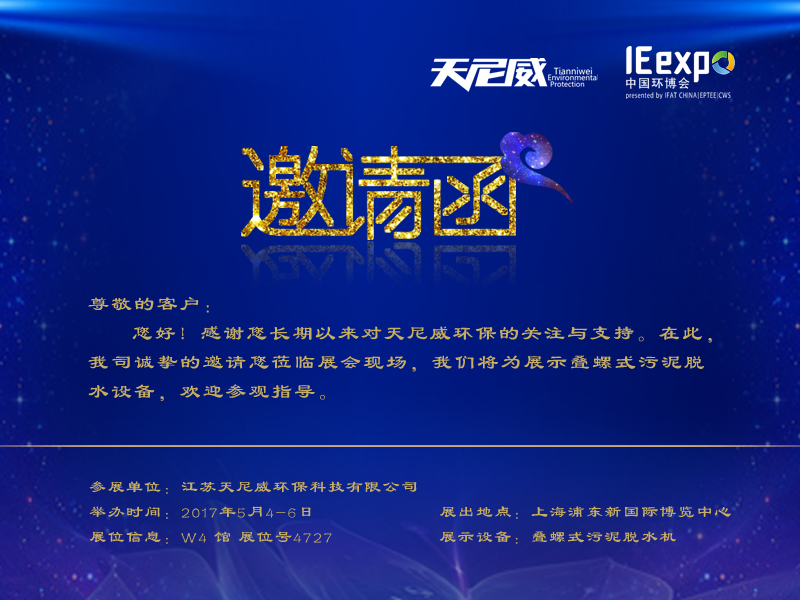 天尼威環(huán)保設(shè)備有限公司將于2017年05月04-06日在中國上海新國際博覽中心隆重參加展會,歡迎新老客戶蒞臨參觀,指導(dǎo)!